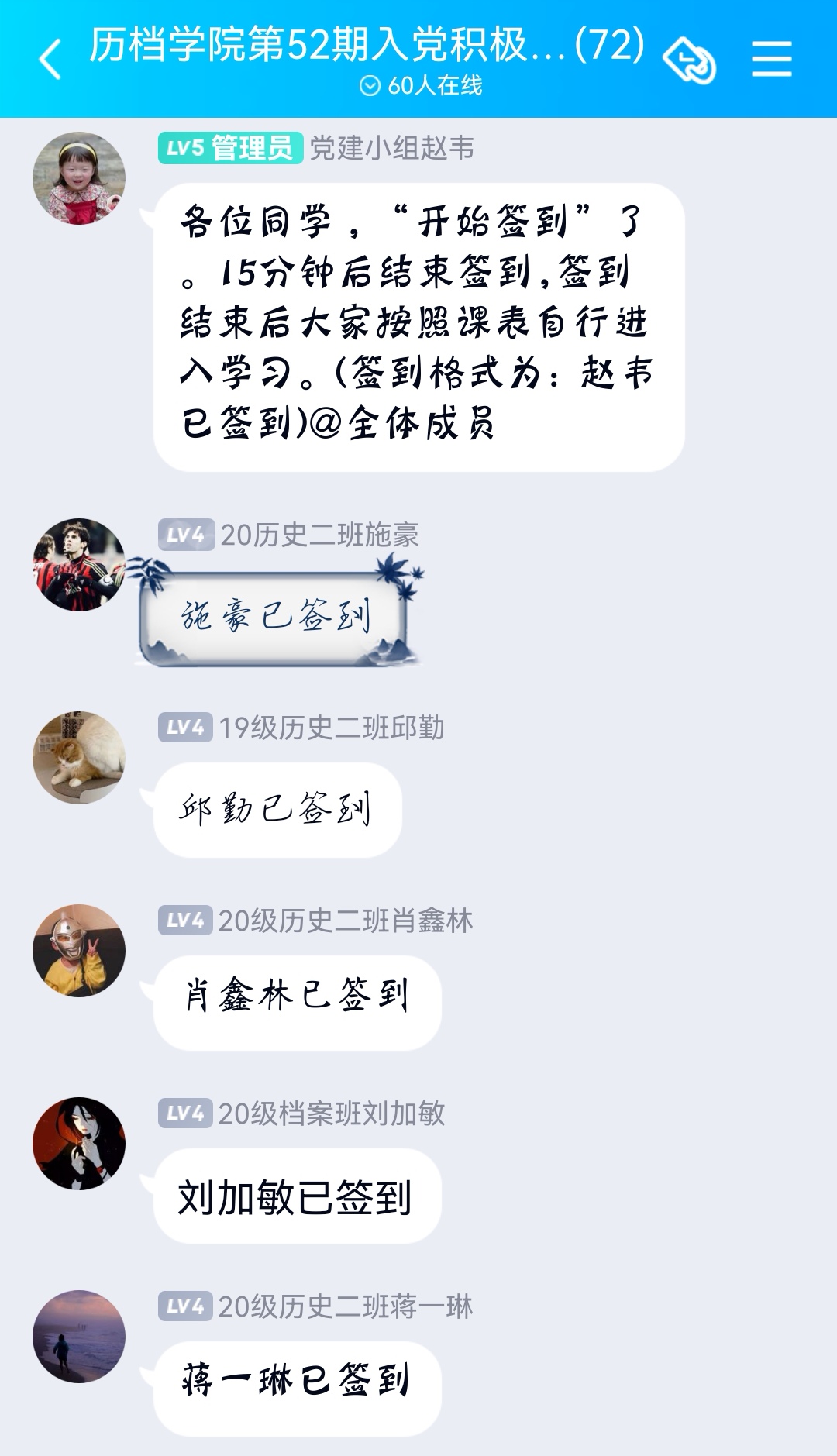 2021年10月16日,bwin必赢第52期入党积极分子培训班为期两天的网课培训正式开始。该培训通过“超新尔雅”平台进行,培训开始前,由党建工作小组赵韦同学组织网上签到,随后大家进入平台进行学习。