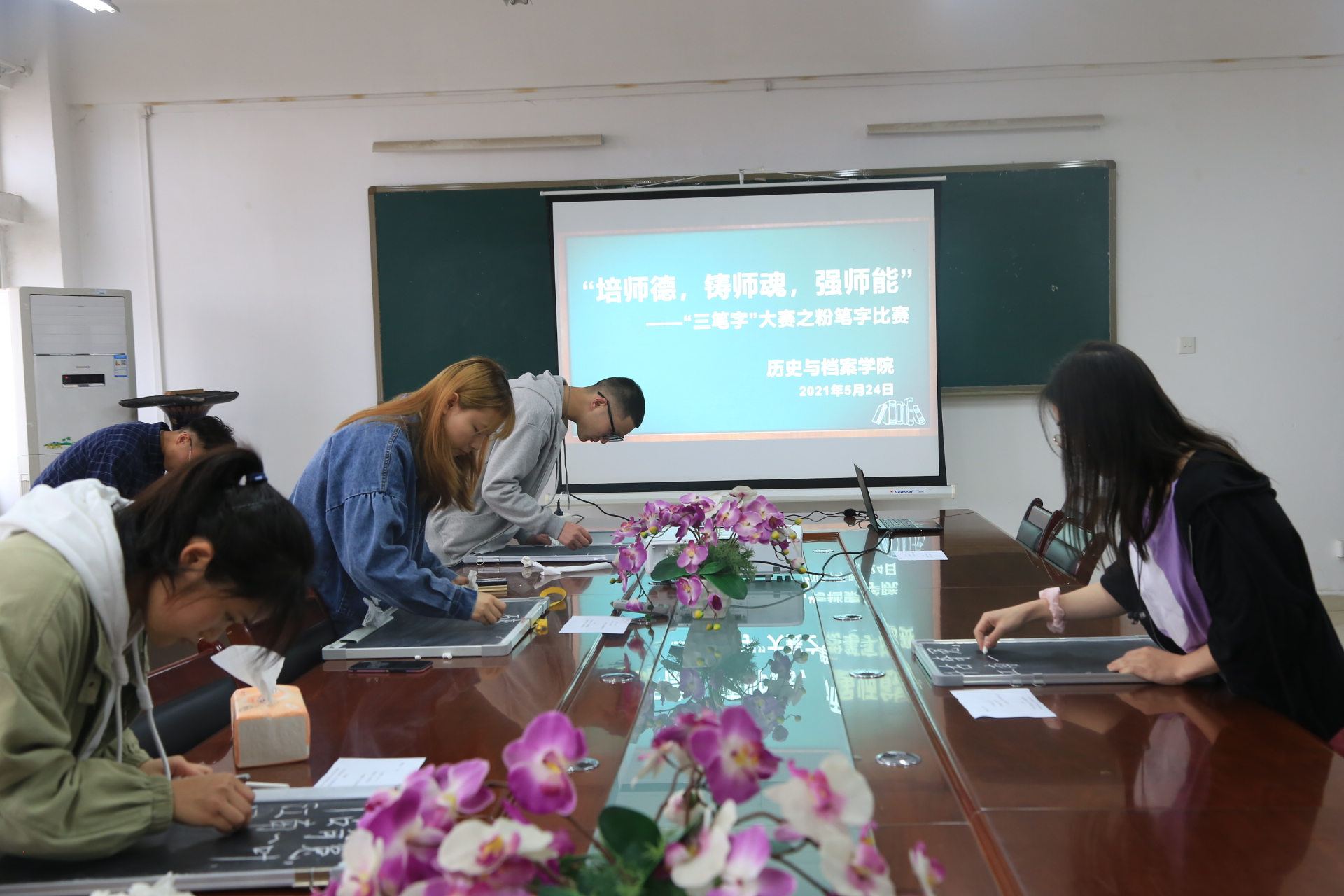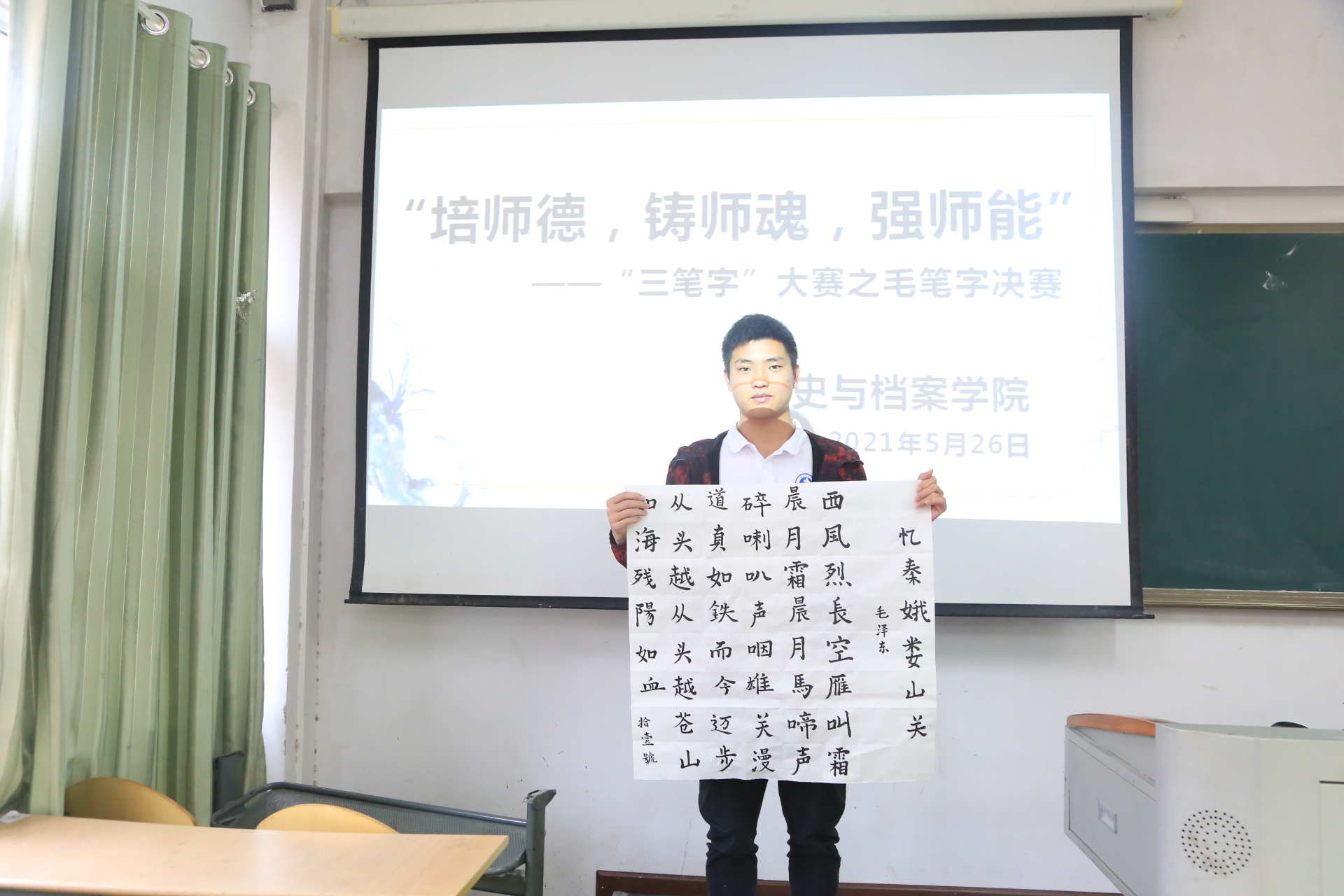 今年的比赛活动,从方案的制定到具体的实施,从四月上旬一直持续到六月初。初赛要求历史系学生(师范生)全部参加,档案学学生(非师范生)自愿参加,在决赛的书写内容上,我们围绕“建党100周年”和党史学习教育主题,准备红色诗词让同学们从中进行选择,让同学们在比赛的同时,又能接受党史教育。比赛针对不同年级设立了不同的项目,并邀请了相关的专业老师进行评选,以保证结果的公信力和公平性,对于优秀的参赛作品,将给予及时地展览和永久性保存。