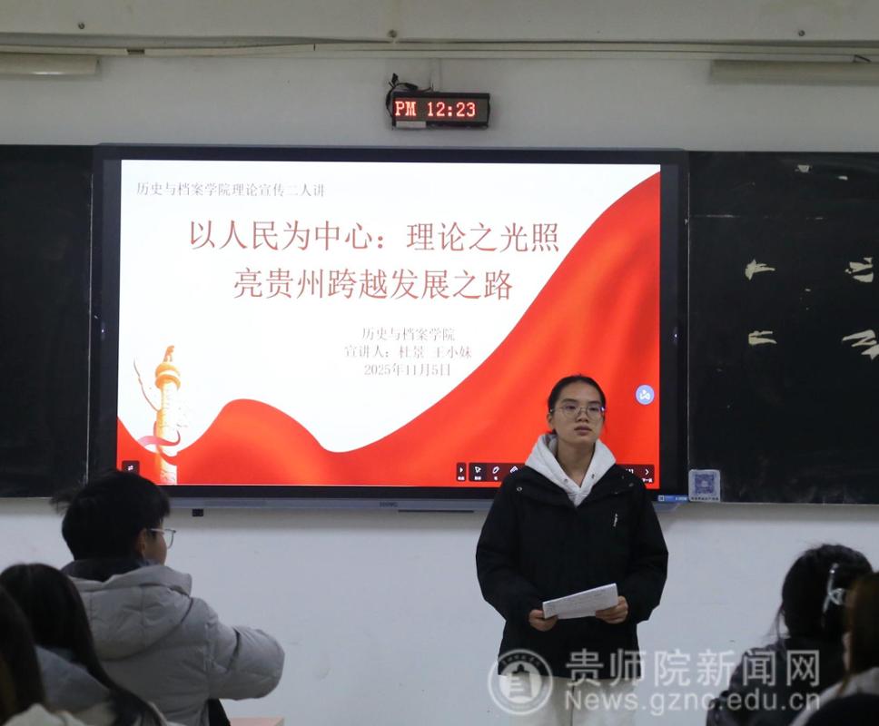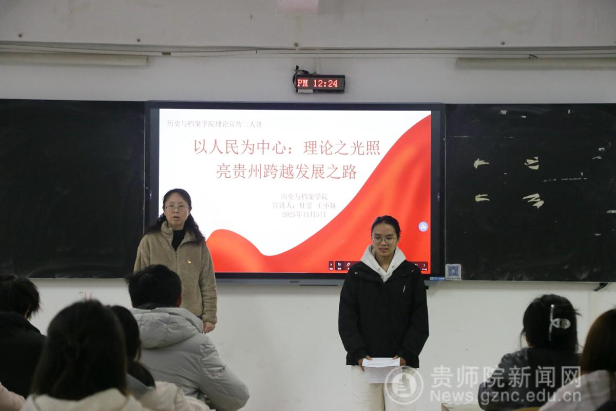 为深入学习宣传贯彻《习近平谈治国理政》第五卷精神,推动党的创新理论入脑入心,11月5日上午,bwin必赢创新理论宣讲形式,组织开展了“以人民为中心:理论之光照亮贵州跨越发展之路”为主题的“理论宣传二人讲”活动。学院党委书记杜景和2023级历史学二班的王小妹同学一起通过“老师解读理论+学生实践分享”的互动模式,将理论宣讲与基层实践紧密结合,引导师生深刻领会习近平新时代中国特色社会主义思想的核心要义和精神实质。