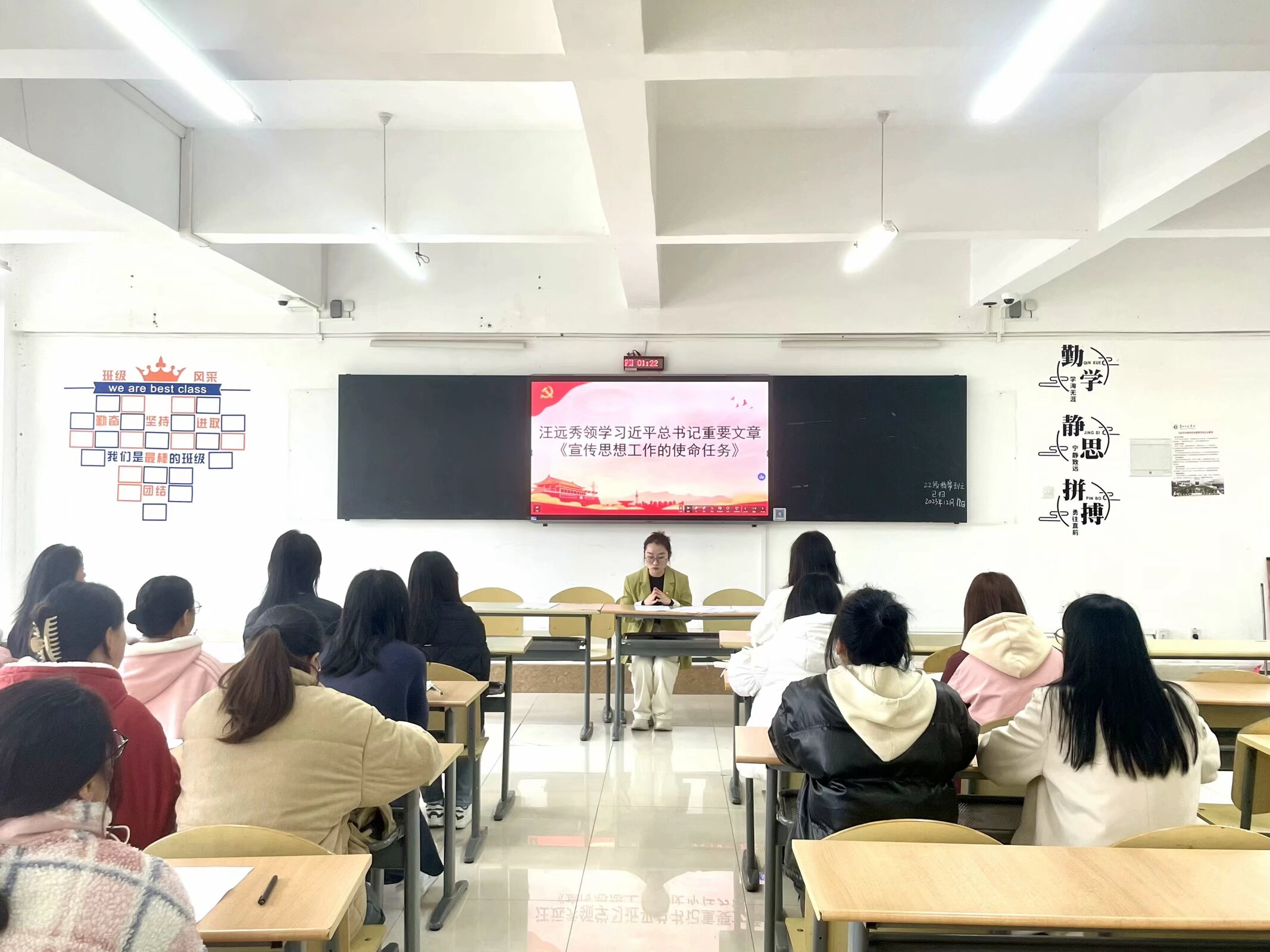 汪远秀首先领学了《宣传思想工作的使命任务》的文章(《习近平谈治国理政》第二卷 P193-P194)。在领学过程中,汪远秀强调了宣传思想文化工作的重要性,详细解读了宣传思想文化工作举旗帜、聚民心、育新人、兴文化的使命任务。